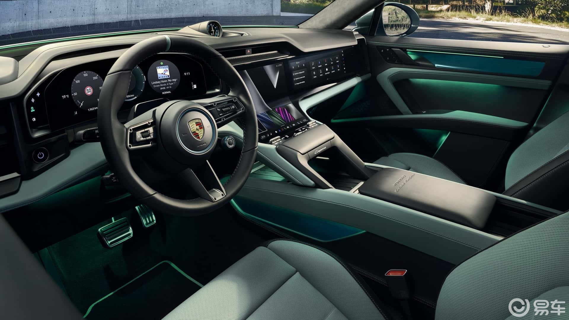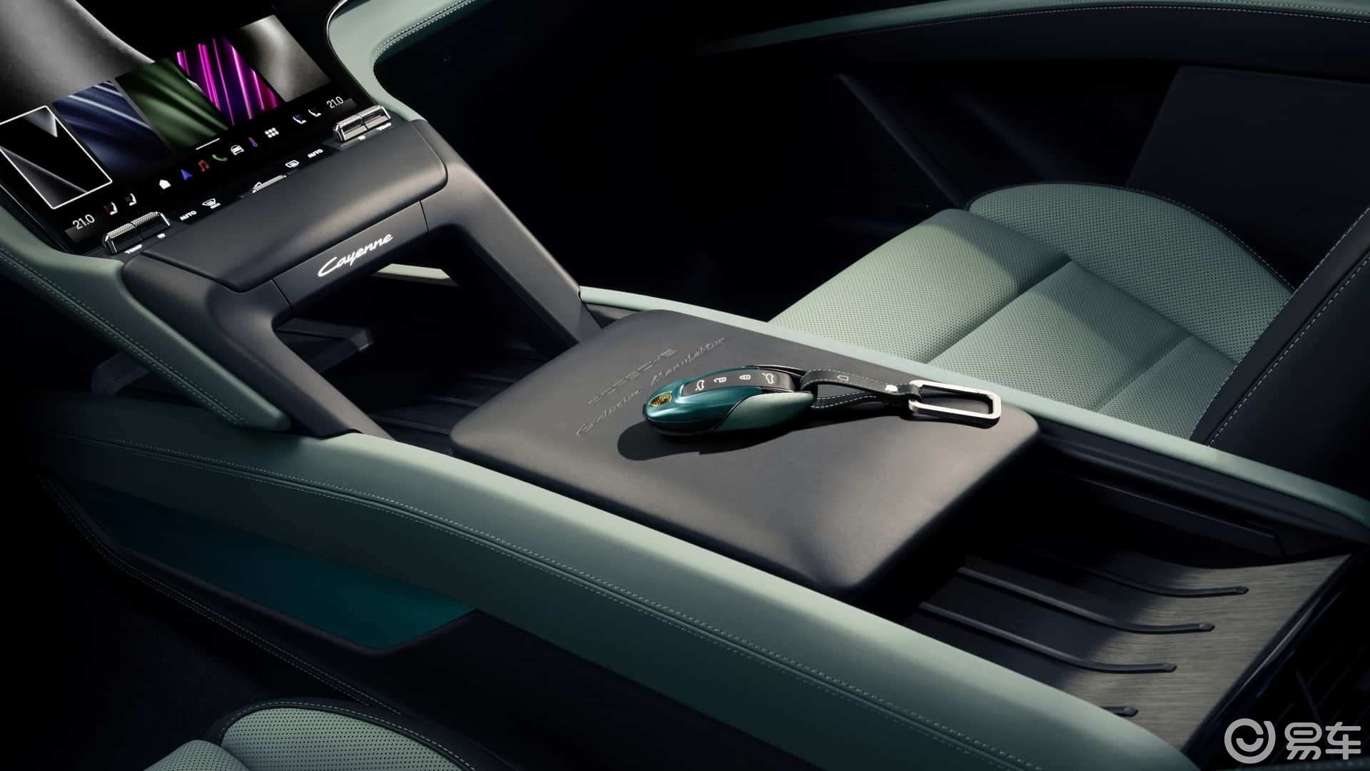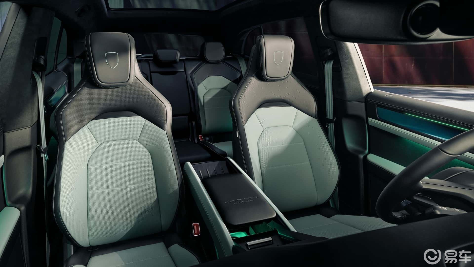 Sport Chrono套件能激活超车功能,能在10秒内解锁120马力。甚至内置了赛道模式,尽管很难想象有多少人会开着这么大且重的电动SUV上赛道。Cayenne S首次亮相,但其他电动车型也可选装内饰风格套件,配备黑绿双色车厢,以呼应神秘绿涂装。绿色点缀延伸至车门、方向盘和仪表盘,完成整体造型。