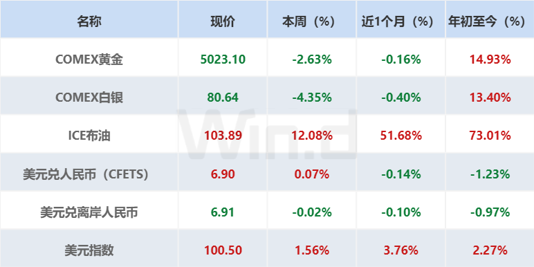 外汇市场方面,美元指数上涨1.56%;人民币对美元汇率平稳,美元兑在岸人民币(CFETS)上涨0.07%,美元兑离岸人民币下跌0.02%。