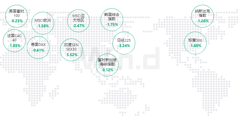 亚洲市场方面:日经225指数下跌3.24%;韩国综合指数下跌1.75%,富时新加坡海峡指数下跌0.12%,印度SENSEX30指数下跌5.52%。