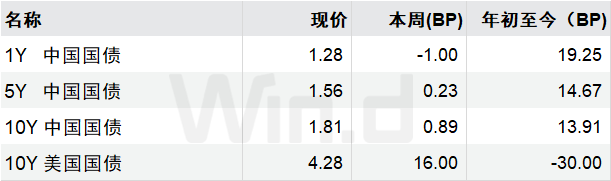 最近一周,国债收益率表现分化。1年期中国国债收益率下行1.00个基点至1.28%,5年期上行0.23个基点至1.56%,10年期上行0.89个基点至1.81%。10年期美国国债收益率上行16个基点至4.28%。